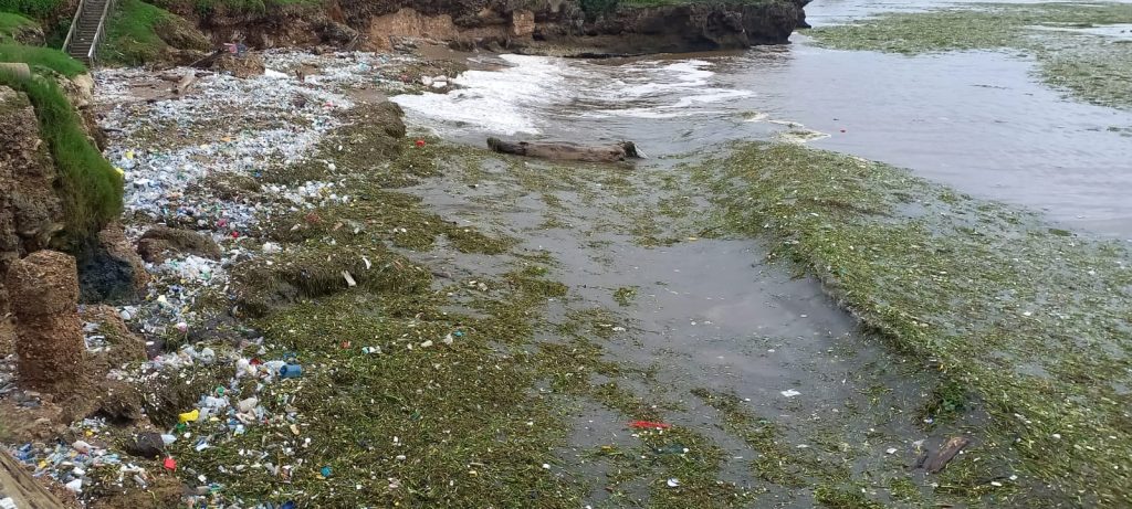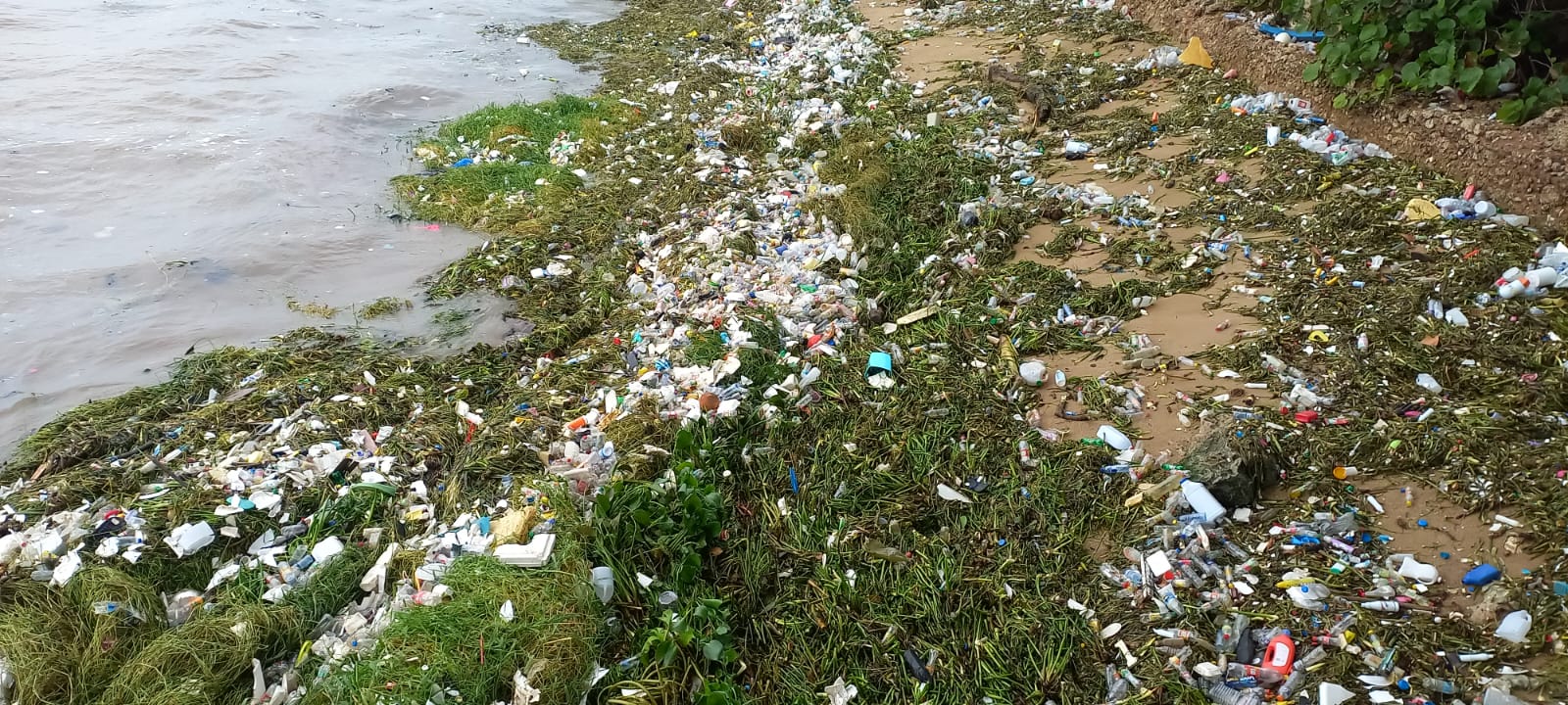 Residuos sólidos, principalmente plásticos, lilas, colchones, troncos y otros desperdicios, inundan hoy el frente marino del Malecón de Santo Domingo, luego de ser arrastrados al mar por el río Ozama.