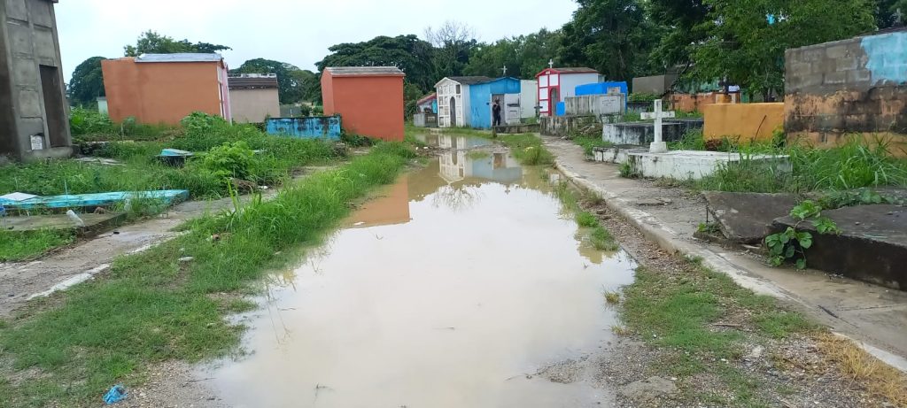 En este lugar donde se descansan los cuerpos de los fallecidos, algunas calles interiores se tornan intransitables por el lodo y charcos de agua a raíz de las lluvias recientes.