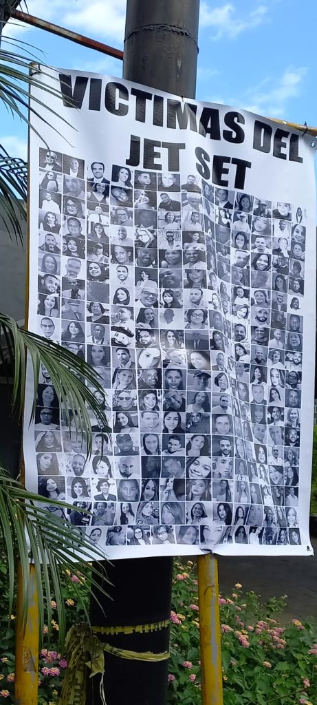 Familkiares y relacionados colocan mural con fotografías de las víctimas de la discoteca Jet Set.
