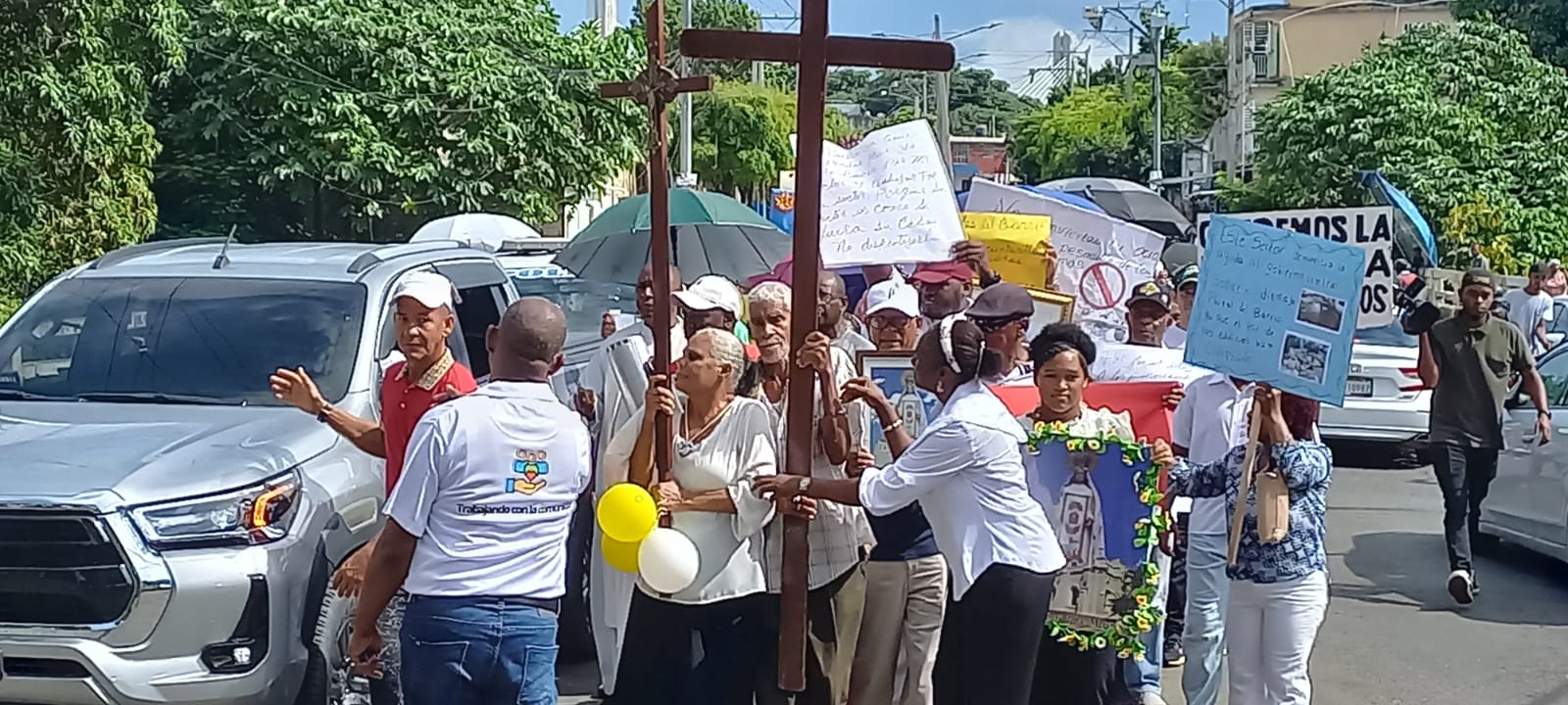 Los párrocos de esas iglesias encabezaron una procesión junto a feligreses que recorrió cada uno de los barrios citados para terminar en Guachupita, donde la basura y las aguas residuales brotan dentro y fuera de los apartamentos, con las que conviven cientos de familias, entre ellos ancianos, niños y hasta enfermos mentales.