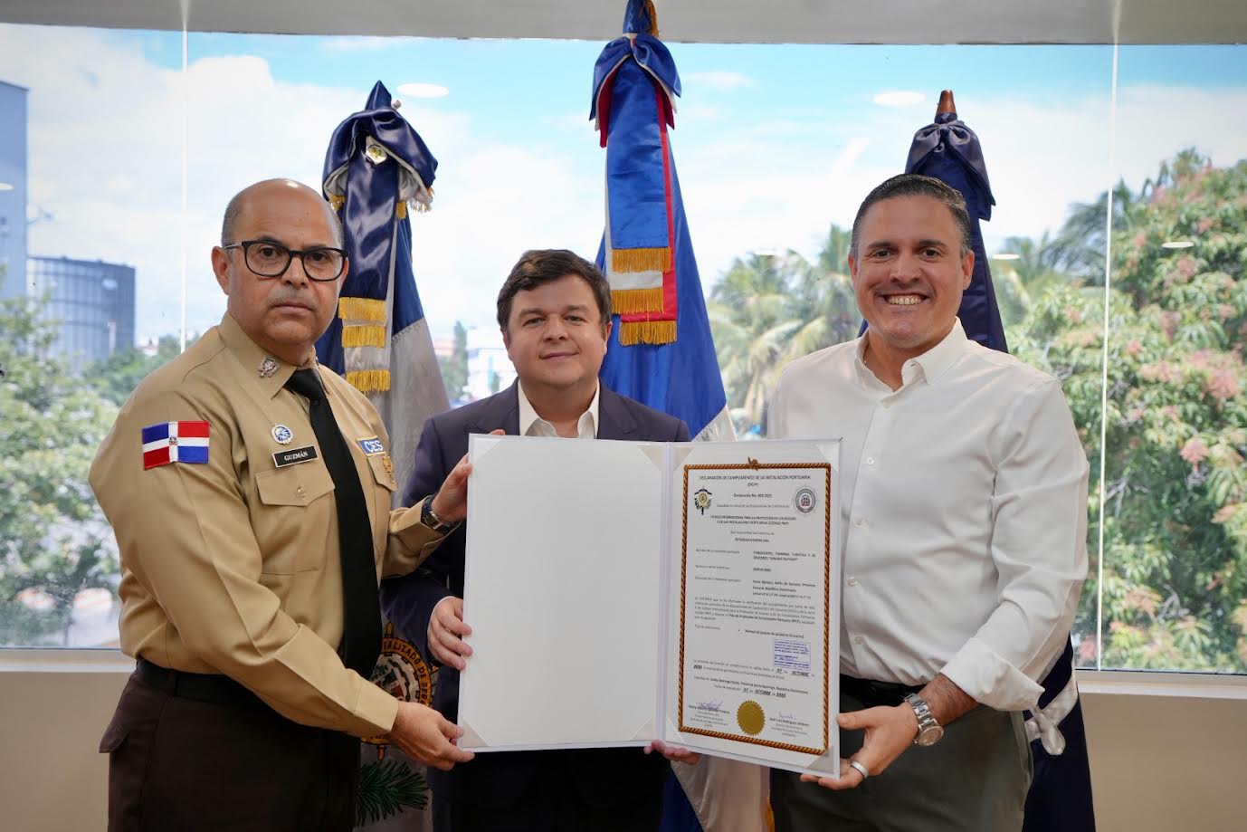 SANTO DOMINGO, República Dominicana.- El director ejecutivo de la Autoridad Portuaria Dominicana (APORDOM), Jean Luis Rodríguez, acompañado por el director general del Cuerpo Especializado de Seguridad Portuaria (CESEP), contralmirante Henry Antonio Guzmán Taveras, ARD, firmaron y entregaron la certificación para la Protección de Buques y las Instalaciones Portuarias (Código PBIP), al fondeadero, terminal turística y de cruceros Samaná Bayport, al nordeste de la República Dominicana.