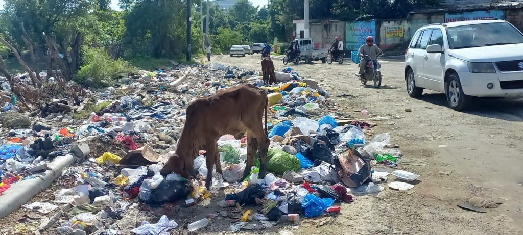 Reces en busca de comida entre vertederos improvisados en calle principal de Los Guaricanos. Luego estos animales son sacrificados y consumidos por los humanos en mercados y supermercados.