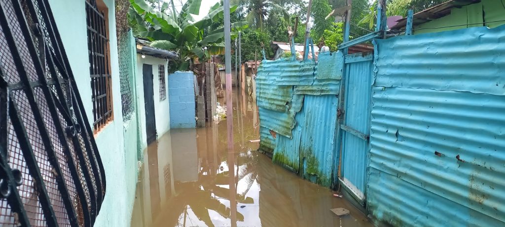 En Los Coordinadores de Sabana Perdida, en Santo Domingo Norte, la situación es todavía peor, las aguas sucias del Ozama no ceden y las casas se observan media de agua.